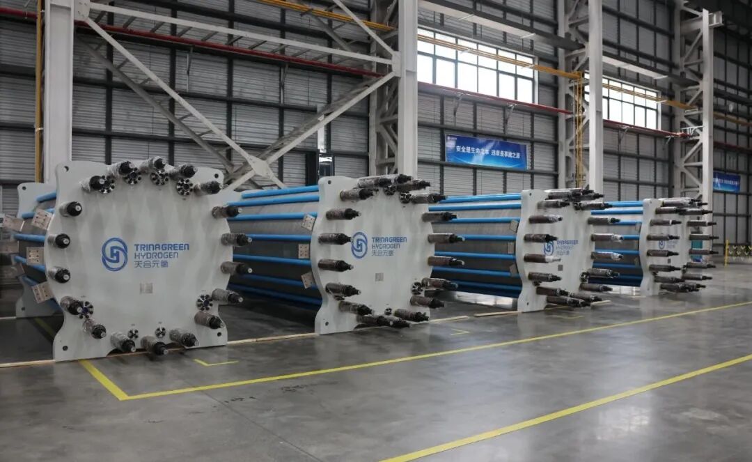 近日,天合元氢顺利完成一批 1000Nm³/h 碱性制氢装备的集中交付,该批设备已运抵国内某大型绿色氨醇项目现场,即将开展安装工作。与以往不同的是,本次交付的电解槽均先在天合元氢扬州基地电解槽测试完成厂内性能检测,设备核心指标测试合格后,才发往项目现场。