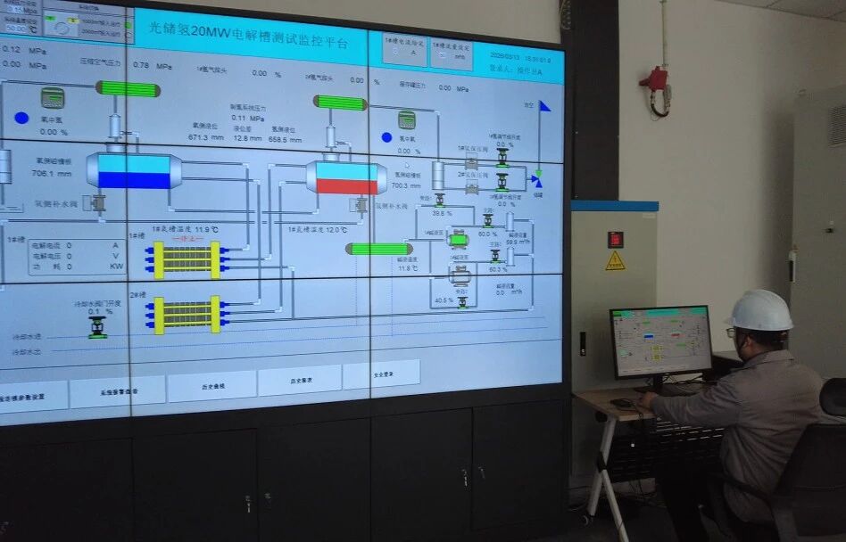 电解槽的出厂测试能力,始终是大型氢氨醇项目用户最为关注的核心服务要素。自天合元氢制氢测试平台建成投运以来,已累计完成超 50MW 规模的设备测试任务。该平台占地面积约 2000 平米,可兼容 500-2000Nm³/h 全量程制氢系统的测试需求。平台不仅能完成设备性能的基础测试与分析,更能对电解槽性能、系统控制等关键环节开展深度验证与研究。平台配套建设了中央控制室,部署了自主研发的综合能源管理系统,集运行监测、分析诊断、协调控制、场站管理四大功能于一体,构建起从设备、系统到场站的三级安全管控体系,实现对制氢系统全层级的验证、研究与分析。